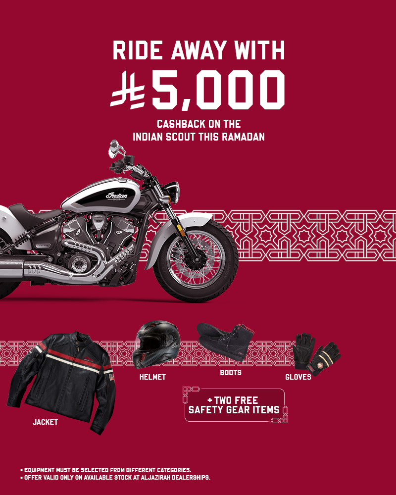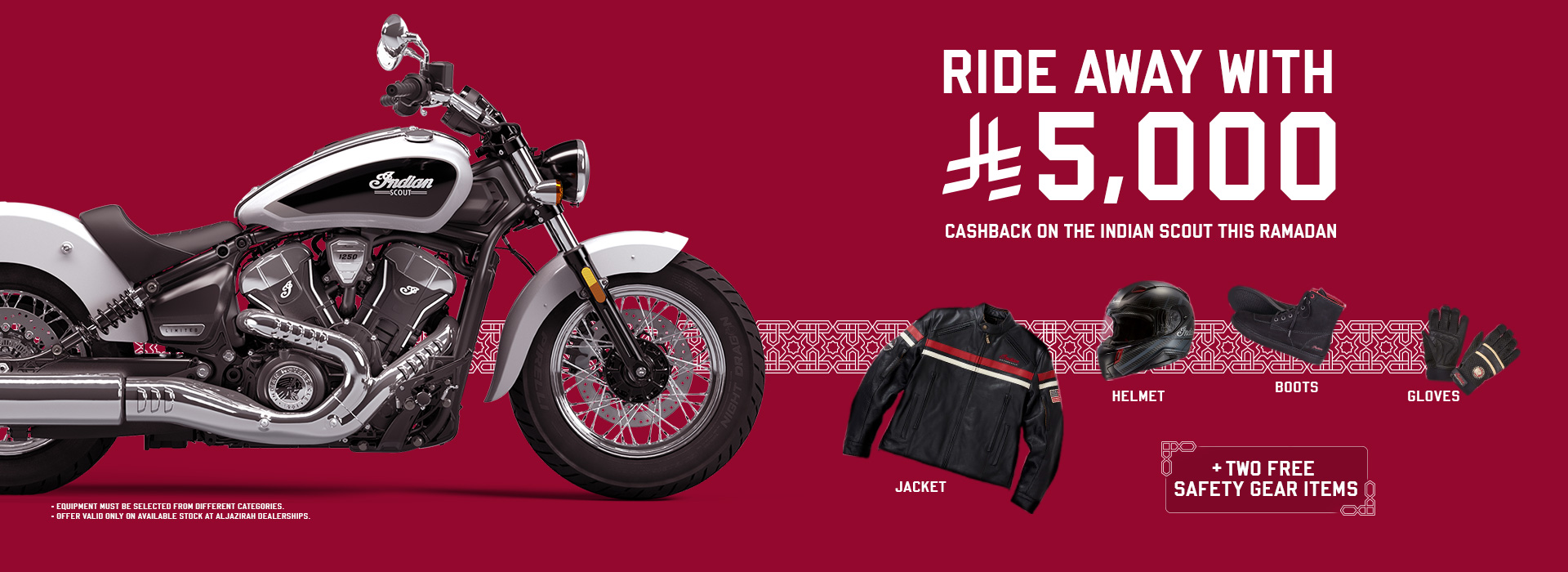 Ride away on the Indian Scout and receive 5,000 cashback, plus two complimentary safety gear pieces to complete your ride.